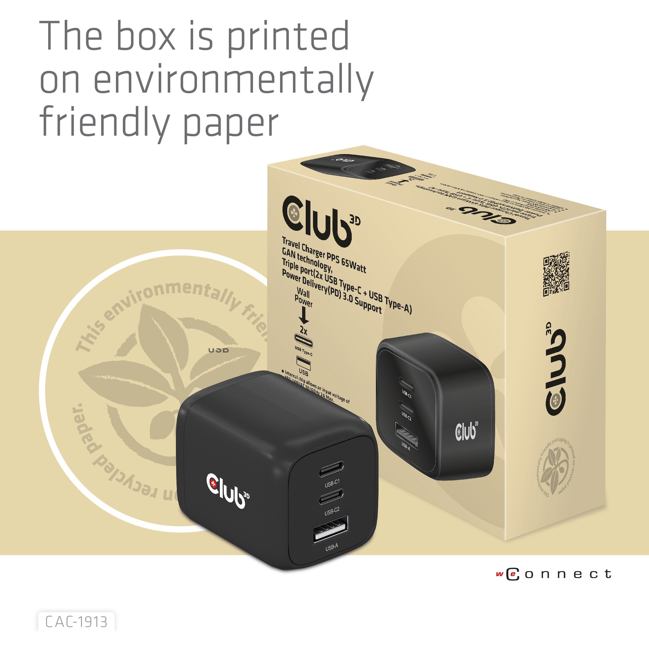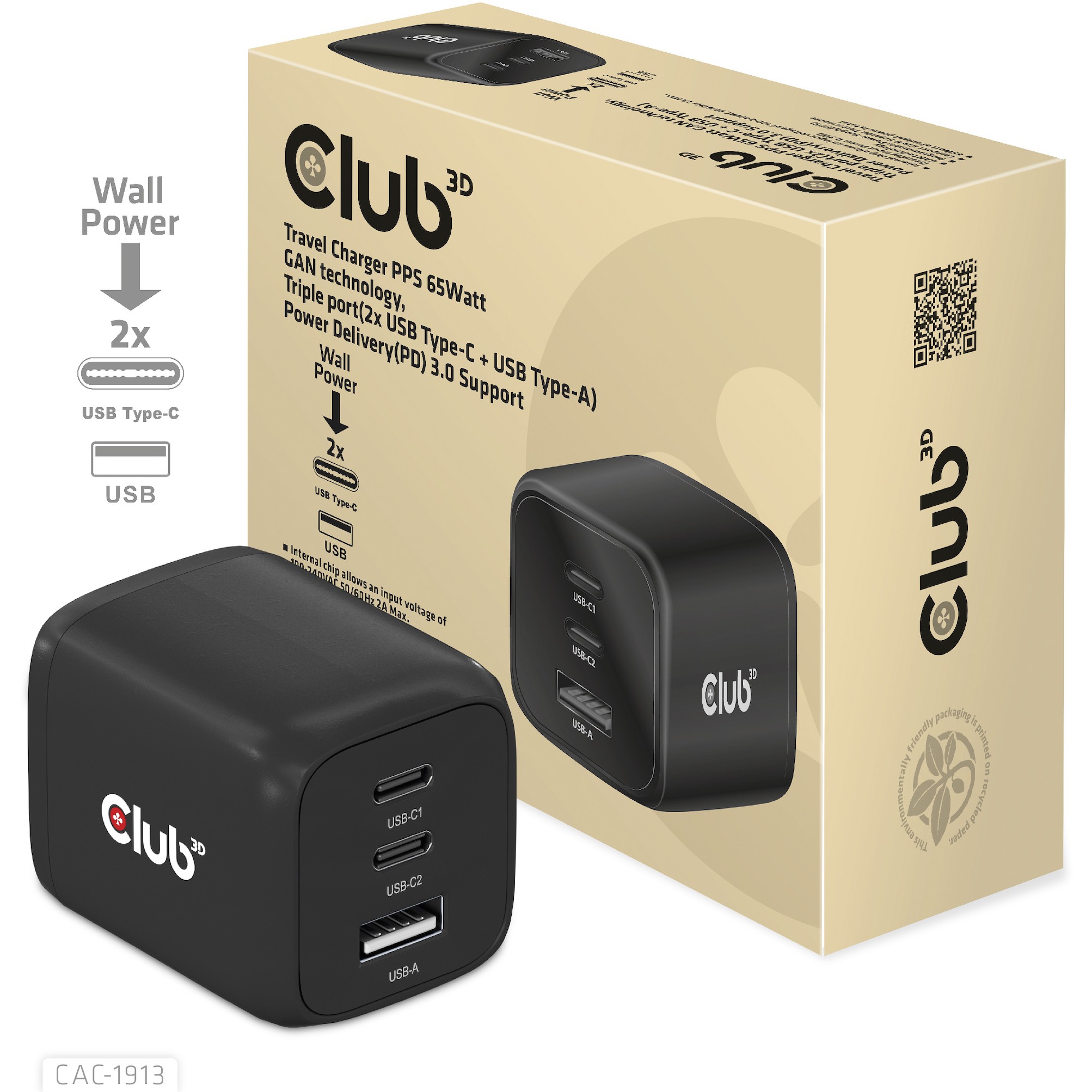 The Club3D CAC-1913 Travel Charger PPS 65Watt GAN technology. Triple port(2x USB Type-C + USB Type-A) Power Delivery(PD) 3.0 Support. GAN technology chipset makes this charger 50% smaller than a 65Watt traditional charger. small enough to carry anywhere.The Programmable Power Supply(PPS) 65Watt wall charger match a variety of PD devices from smart phones to laptops. one for all making charging simple. This wide compatibility charger will be your convenient companion during your business trip or vacation.