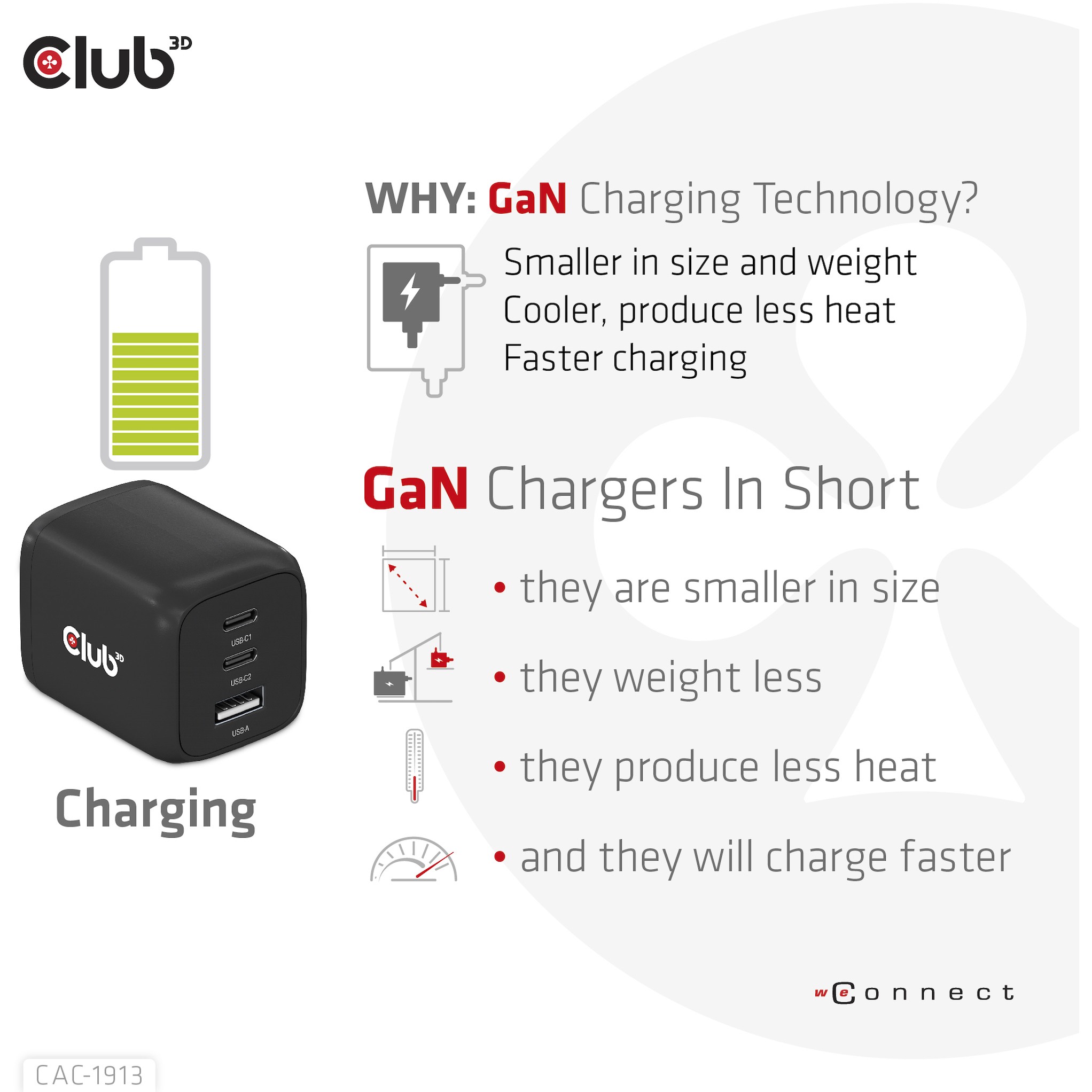 By adopting PD 3.0 Charging technology and charging function through USBType-C interface the Club3D Power Charger offers versatile and unique functionality. It will charge your devices up to 65 Watts. Built-in safeguards protect your devices against excessive voltage. current. overcharging and overheating(OCP-OTP-SCP-OVP).